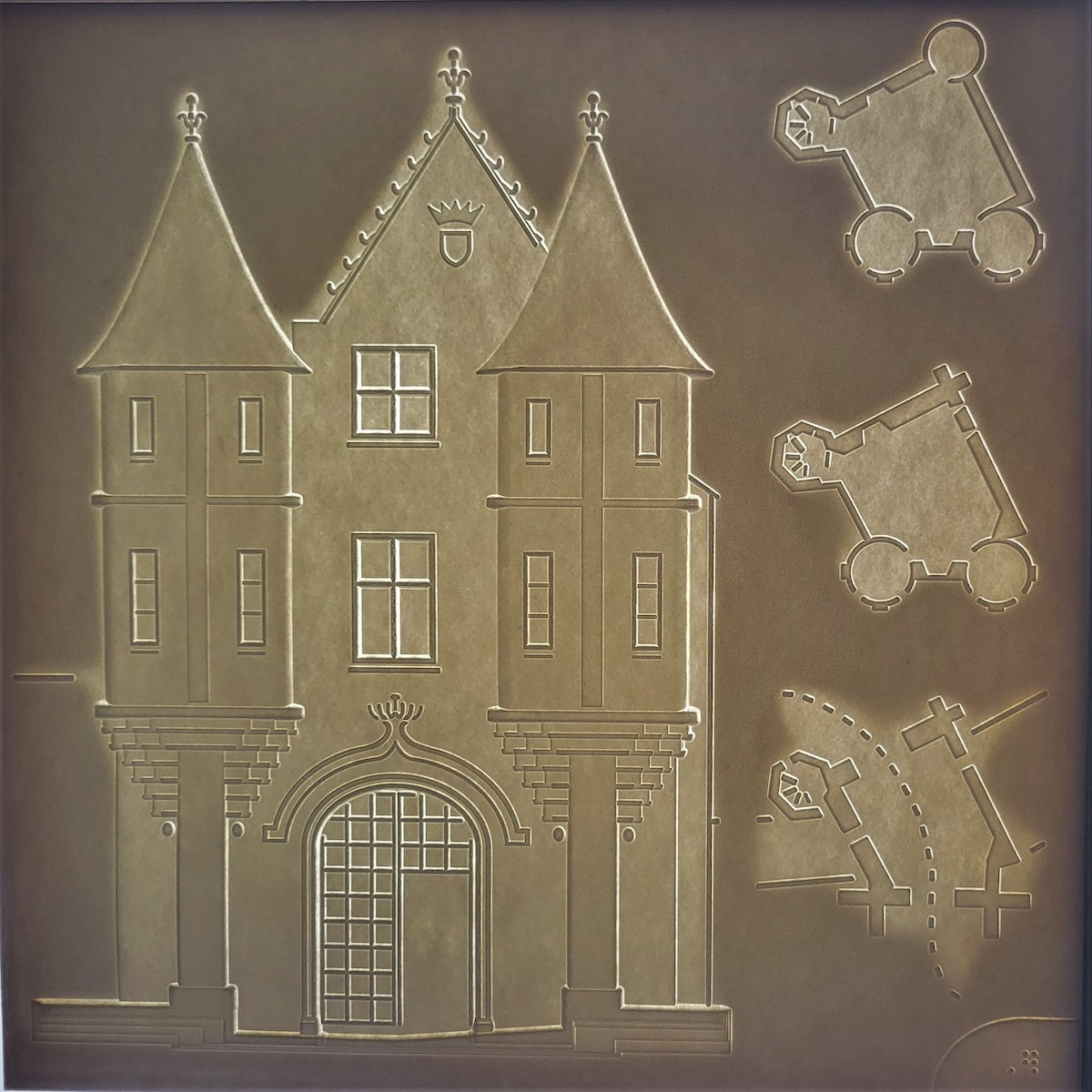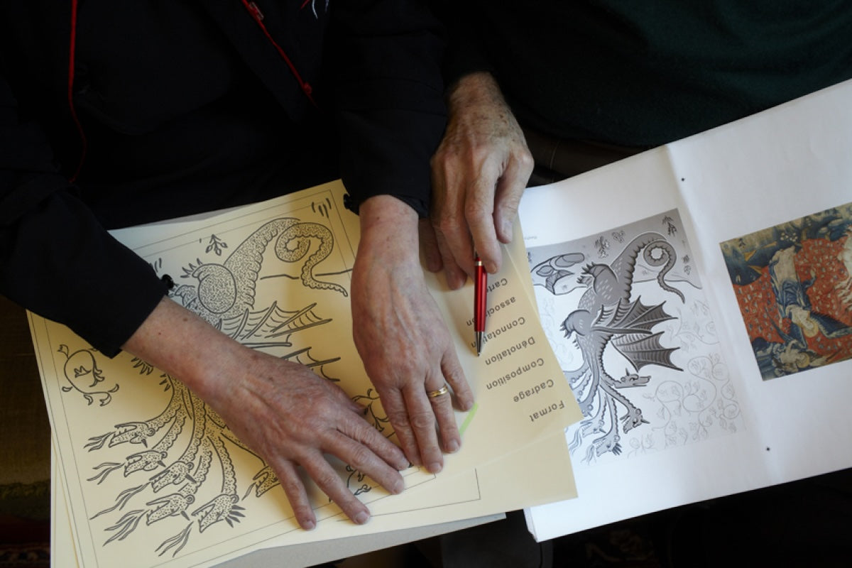 La bête à sept têtes évoquée dans la tenture de l'Apocalypse (14ème Siècle) est traduite en dessin en relief, adapté à la lecture tactile active. Cette phase de test de lisibilité, est préparatoire à la réalisation des gravures et de leurs impressions en gaufrage. Publication par les éditions du Patrimoine du Centre des Monuments Nationaux.
