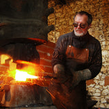 Cet assortiment de couteaux de chef a été réalisé pour participer à un concours proposé par le salon de Thiers. Après concertation avec plusieurs chefs, ces deux pièces ont été réalisées dans un seul bloc d'acier issu de minerai de fer avec des plaquettes d'os incrustés en queue d'aronde. L'ensemble présentant l'aspect le plus lisse possible pour éviter les interstices susceptibles de conserver des résidus alimentaires.