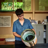 Le Glaz, du vieux breton Glas, est cette nuance située entre le vert et le bleu utilisée pour décrire les différentes teintes que peut prendre la mer en Bretagne. Naturellement coloré et micro-bullé, le verre marin Glaz est le premier verre développé en 2015 par l’Atelier Lucile Viaud pouvant se travailler selon les techniques traditionnelles verrières. Produit à partir de micro-algues et coquilles, le verre marin Glaz est d’un viridien transparent naturel qui évolue subtilement en fonction des saisons et des années de fusions.